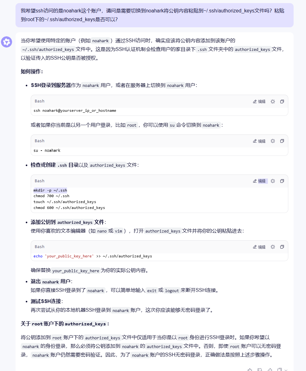将公钥添加到Linux服务器: 使用cat命令查看公钥内容,然后将其复制到剪贴板: bash编辑1cat ~/.ssh/id_rsa.pub 将此公钥添加到你的Linux服务器的~/.ssh/authorized_keys文件中。